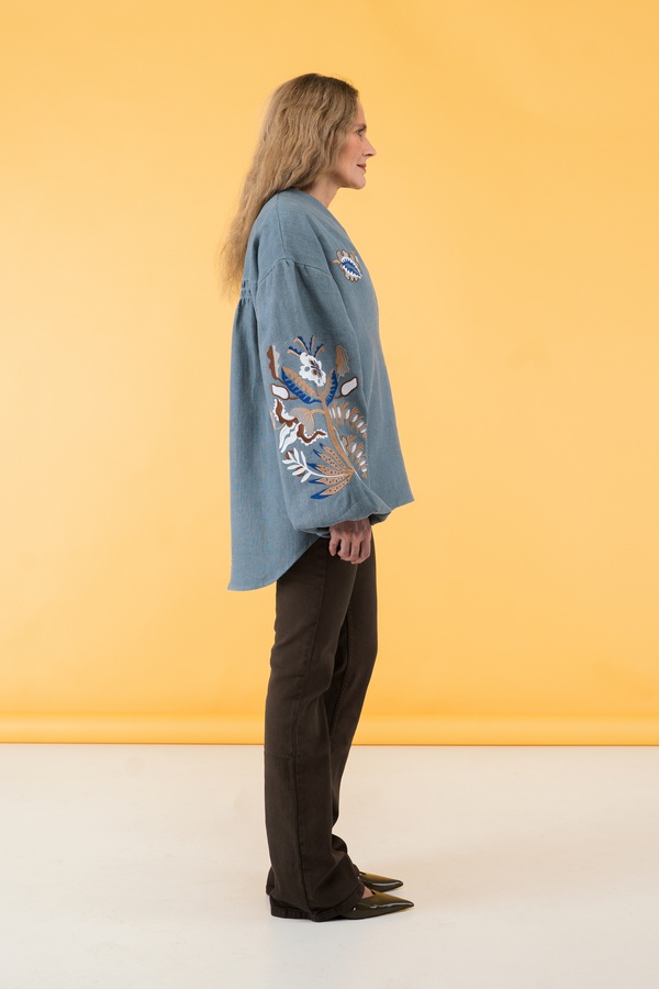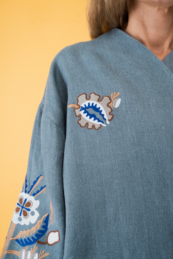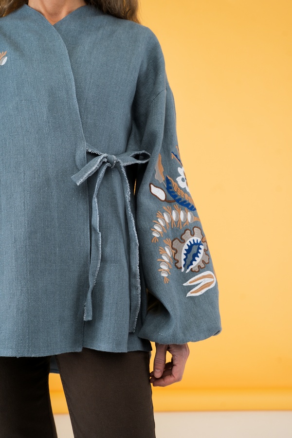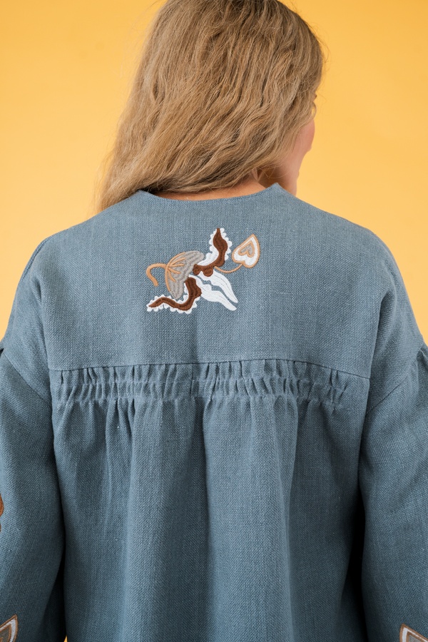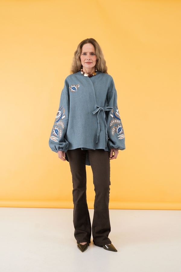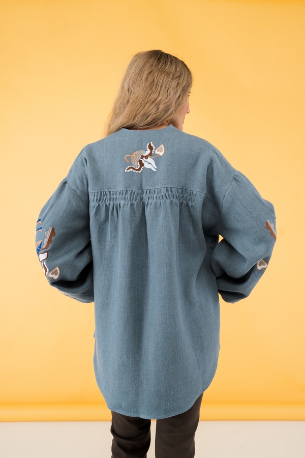 Сорочка виконана зі щільного, фактурного льону, що дозволяє носити її також у прохолодну погоду.