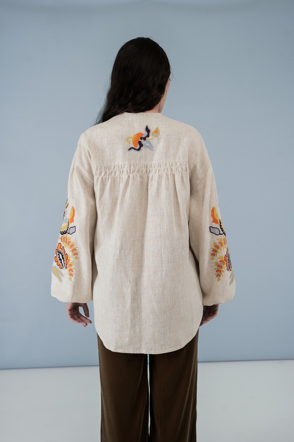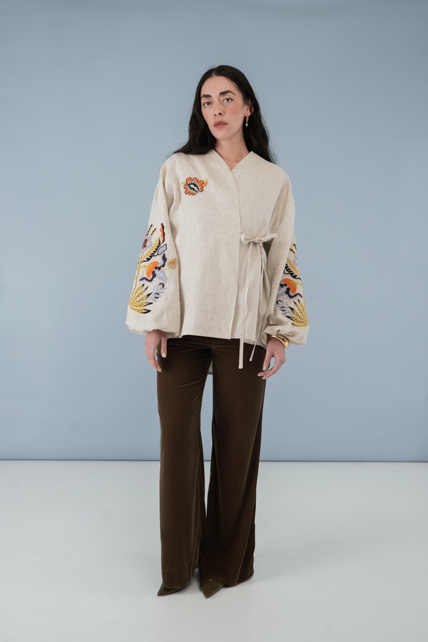 Особливості крою: фасон сорочки – на запах з фіксацією на внутрішню та зовнішню зав’язку, неприталений силует, манжет рукава зібраний на резинку. Спинка сорочки прикрашена декоративною зборкою.