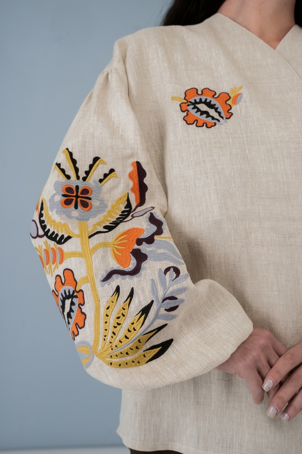 Орнамент вишивки на сорочці натхненний роботами сестер Ярини та Софії Гоменюк, майстринь українського народного декоративного розпису. Сестри працювали гуашшю на папері та картоні, використовуючи саморобні пензлі, займались настінним розписом. Їхні роботи вирізняються фантазійністю та життєствердним настроєм, квітково-рослинні мотиви часто мають людські риси.