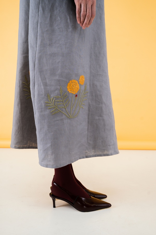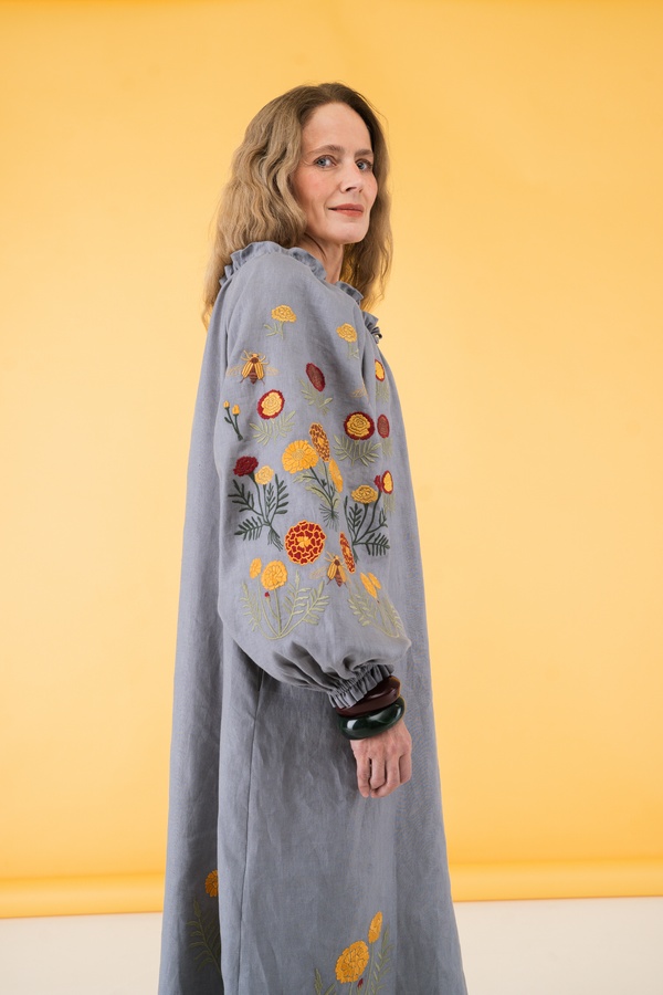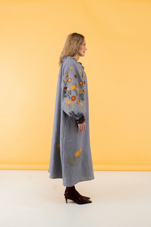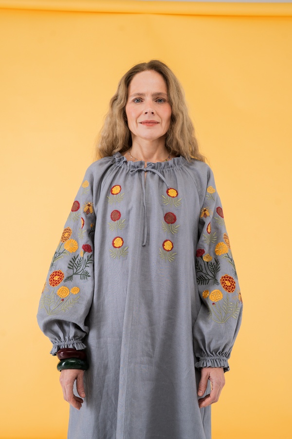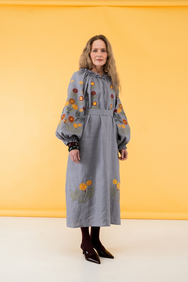 На рукавах, грудях та подолі сукні різнобарвними нитками вишита «квітка-пісня», що часто зустрічається в українській культурі – чорнобривці.