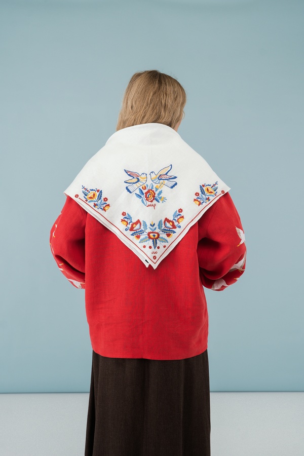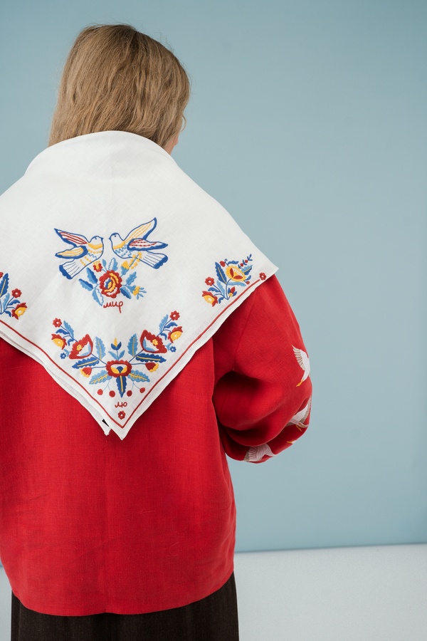 Хустка виготовлена з цупкого білого льону та прикрашена орнітоморфно-рослинною композиція з квітів та пари голубів, слова “Лю” та “Мир”.